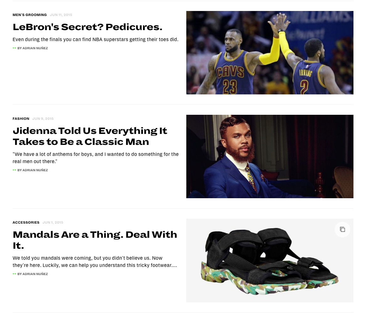 As a freelance writer for the heralded fashion publication, I contributed content to the style section of Esquire.com with posts on the topics of menswear, luxury, accessories and footwear.